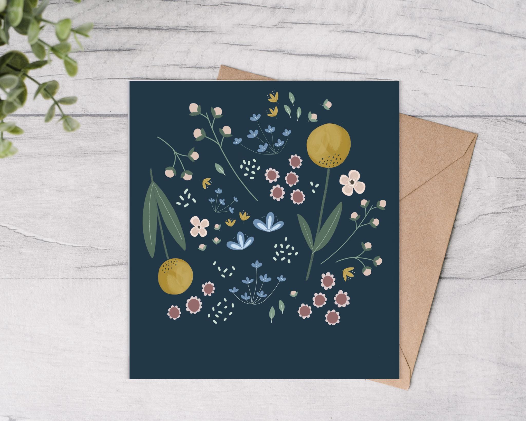 Each card features a whimsical floral design in soft, painterly tones set against a rich navy background. Elegant yet playful, this set brings a sense of calm charm to your stationery drawer, ideal for writing heartfelt notes, thoughtful messages, or just-because greetings that brighten someone’s day.