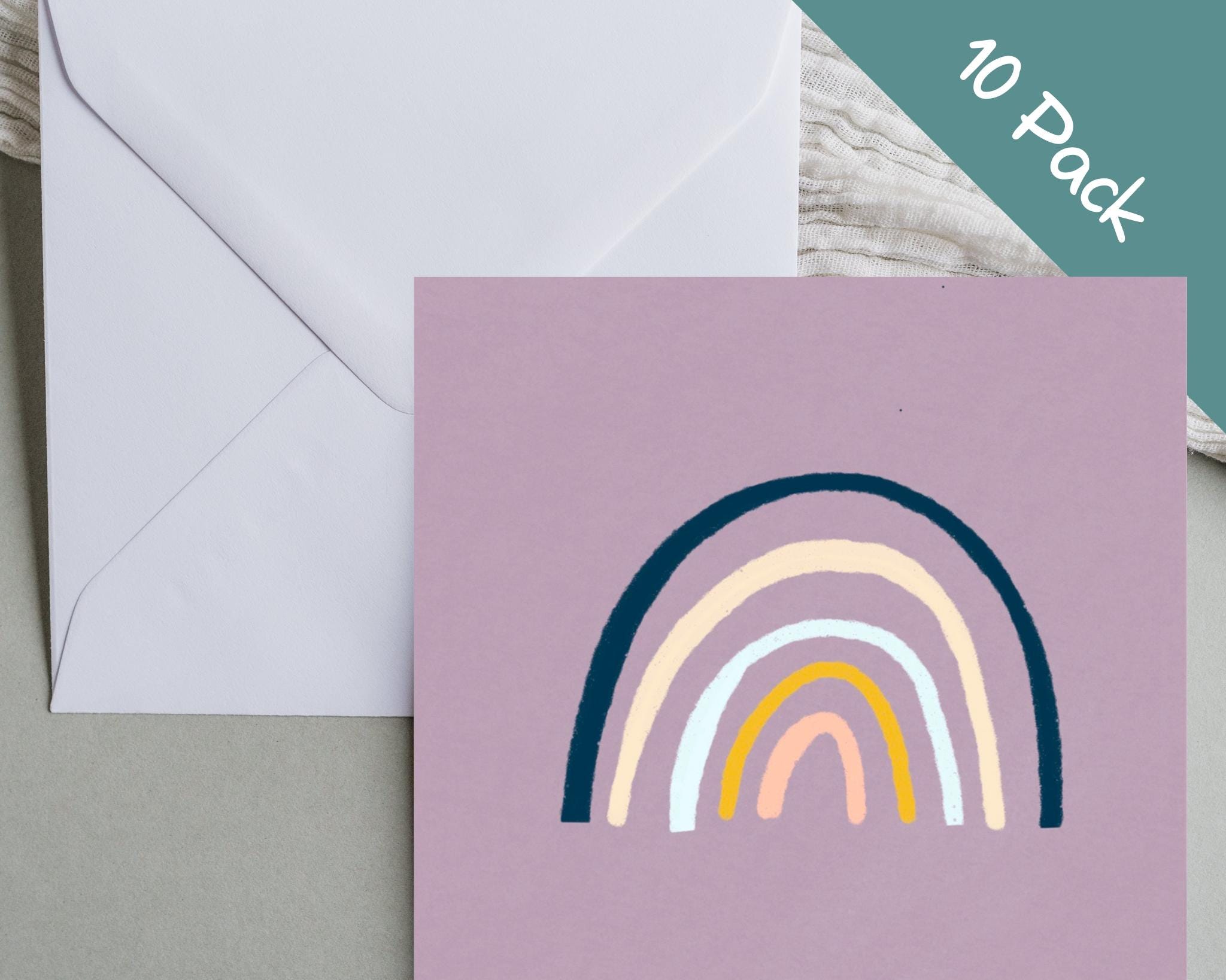 Each note card features hand-drawn rainbow arcs in a soothing palette of blush, butterscotch, smoke, and duck egg, all set against a warm mauve background. The design is joyful without being loud—perfect for both children and grown-ups alike.